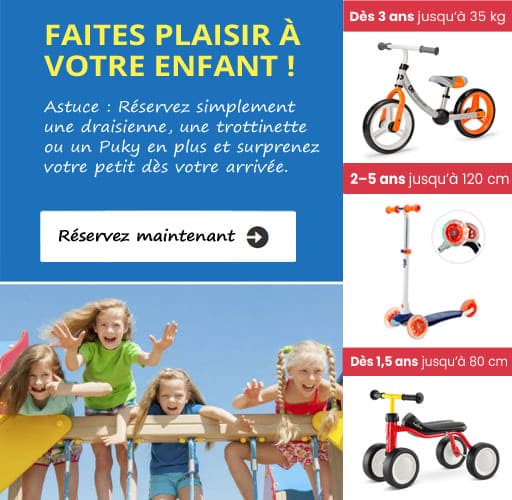 Profitez de votre arrivée à l’aéroport de Palma pour louer à petit prix : trottinette enfant avec roues lumineuses, joli vélo sans pédales ou Pukylino pour les plus petits.