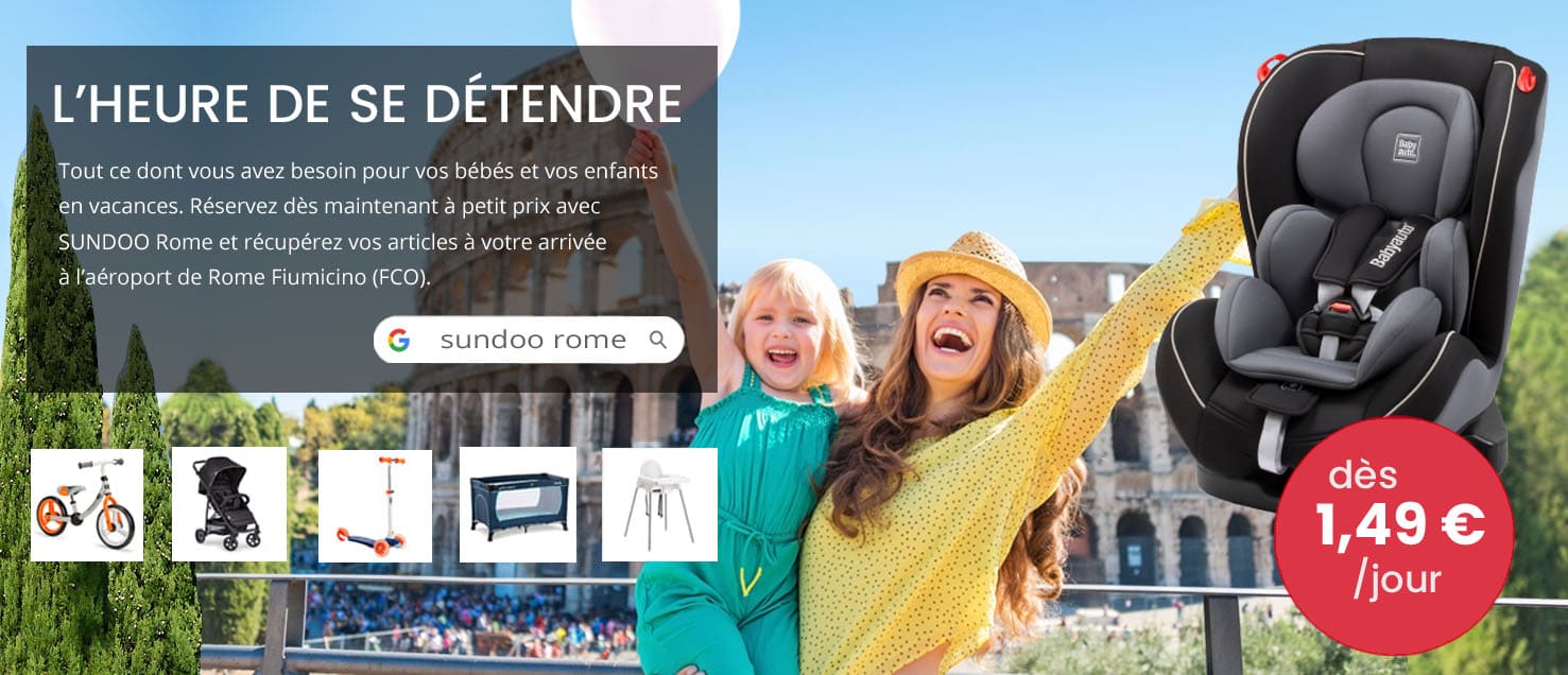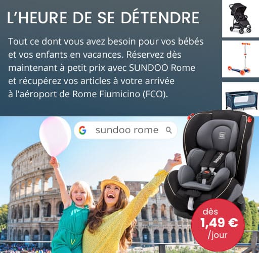 Avec SUNDOO, vous louez facilement du matériel pour bébés et enfants – du siège auto à la poussette. Tout est prêt pour vous dès votre arrivée à l’aéroport de Rome Fiumicino “Leonardo da Vinci”. Que vous ayez besoin d’un siège dos à la route, d’une coque bébé, d’un rehausseur, d’une poussette, d’une chaise haute, d’un lit parapluie, d’une trottinette ou de nombreux autres accessoires pratiques – nous veillons à ce que votre famille arrive détendue et parfaitement équipée.