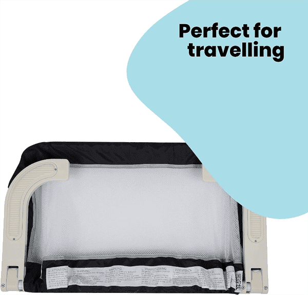 Grâce à son cadre métallique pliable, le protège-chute se replie à une longueur de seulement 71 cm pour le transport, se range à plat dans le coffre ou l’armoire et peut être réassemblé en deux étapes simples une fois arrivé à destination. Le verrouillage automatique s’enclenche automatiquement lorsqu’il est replié, et le filet perméable à l’air assure un contact visuel et une bonne ventilation.