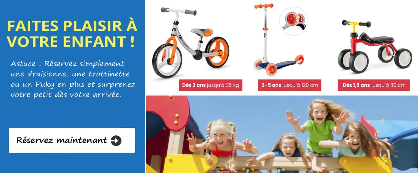 Faites plaisir à votre enfant : louez par exemple un trottinette pour enfants avec roues lumineuses, un vélo sans pédales cool ou un Pukylino pour les plus petits – le tout fraîchement nettoyé et à un prix journalier avantageux. Ainsi, votre arrivée à Tenerife Sud sera déjà un moment fort – et votre budget restera détendu.